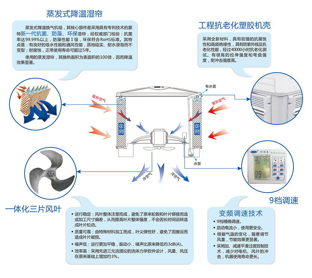 科瑞萊”蒸發(fā)式冷氣機結(jié)構(gòu)示意圖及特點: